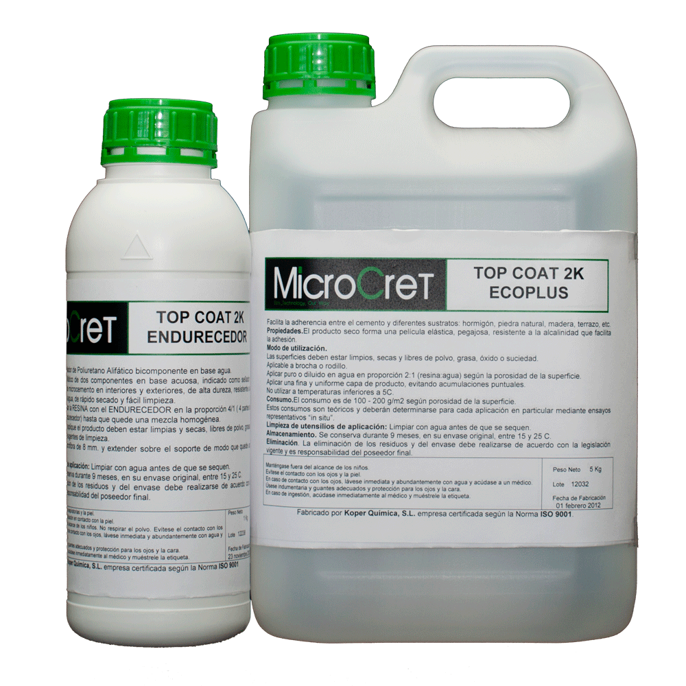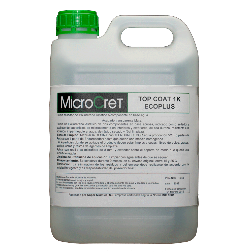 Es un barniz de última generación de poliuretano alifático bicomponente en base agua con grandes prestaciones. Con TOP COAT 2K EcoPlus podemos cubrir cualquier superficie como madera, conglomerado, microcemento, hormigón, mármol, gres... Nos ofrece una protección duradera, resistente a la abrasión e impermeable al agua. Se fabrica en acabado brillo, mate o satinado.